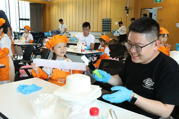 小朋友們稍作休息之后就進(jìn)入了今天的重頭戲——親子DIY蛋糕。大家穿上圍裙,戴上廚師帽,化身小小烘焙師,跟隨著專業(yè)的蛋糕老師,從放蛋糕坯、擠奶油,再到抹面、裝飾。大家都聚精會(huì)神,認(rèn)真聽著老師講解,有條不紊地進(jìn)行制作,最終一個(gè)個(gè)精美的卡通蛋糕在一雙雙巧手中誕生,小朋友們迫不及待地與自己的作品合影,記錄下這一成就感滿滿的時(shí)刻!