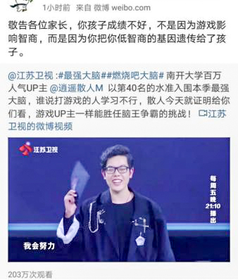 主持人蔣昌建說:“我們一般的印象,當(dāng)然是刻板印象,覺得玩游戲的人好像成績都不一定特別的好。”