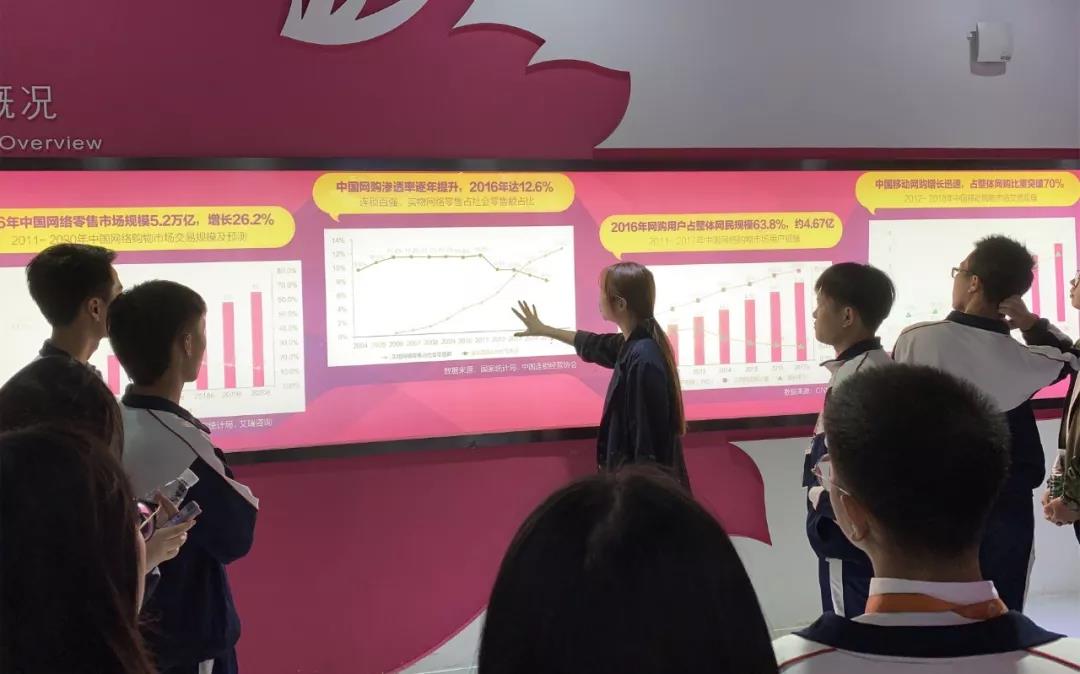 同學們先到達唯品大學。在這里,同學們簡直大開眼界,不僅了解了唯品會的發展歷程和組織文化,以及核心特賣聚焦品類、客戶群體、相關歷史網購數據、全國每日實時在線客戶人數、全國每日實時訂單數量等,還有物流倉儲系統、3D虛擬試衣、公益文化。