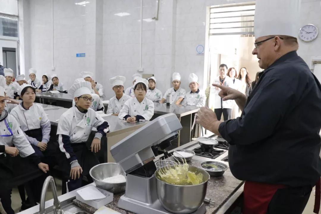 午后,Mr.Stuart一行觀摩烹飪班的面點實訓課,Mr.Stuart興起,決定寓情于教,穿上烹飪專業圍裙,帶上廚帽,要親自教授18烹飪1的同學制作巧克力曲奇。EHI 校長親授,這群孩子有福。