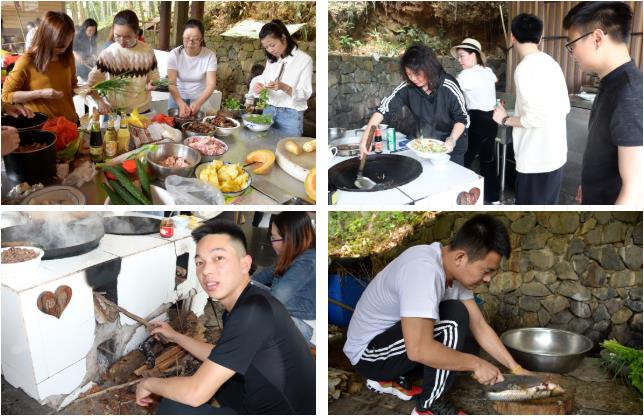 讀書沙龍活動結束,大家集體殺到A哆自助廚房,吃貨們期待已久的柴火飯開始。隨著鐘校的一聲令下,大家一個個化身廚房小能手,有燒火的、洗鍋洗碗的、洗菜切菜的、燒烤的、還有燒飯的大廚,整個場面熱火朝天,三十多人的飯菜,僅用時40多分鐘就完成了,充分體現了大余衡實小學部老師們的協作能力、凝聚力、戰斗力。