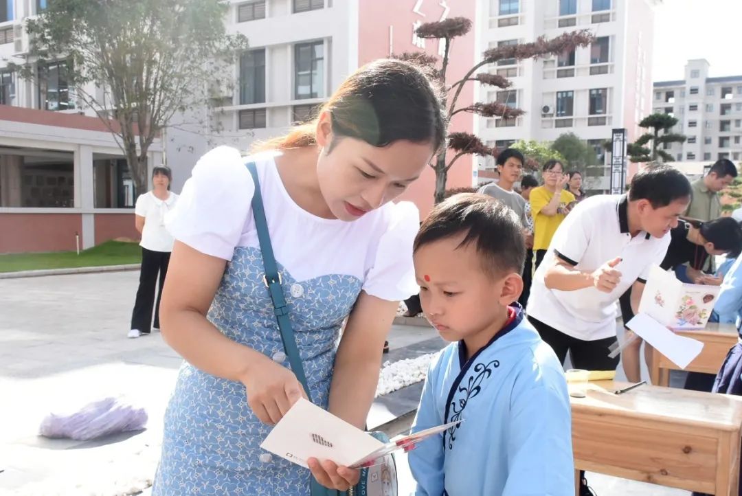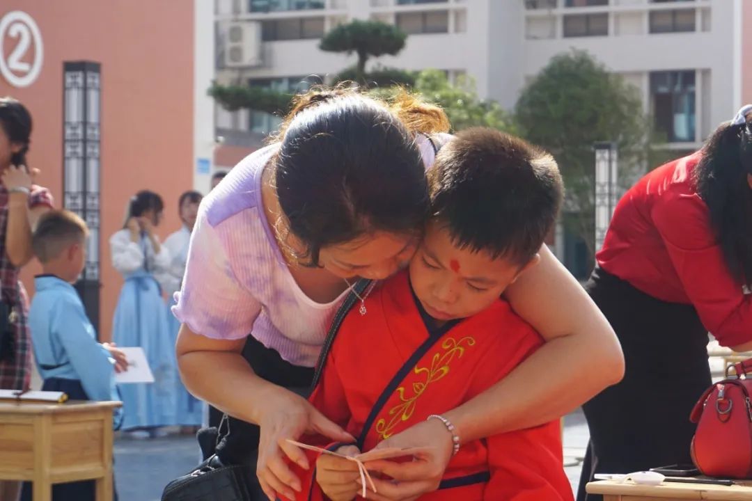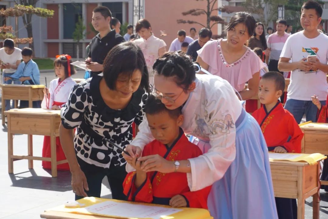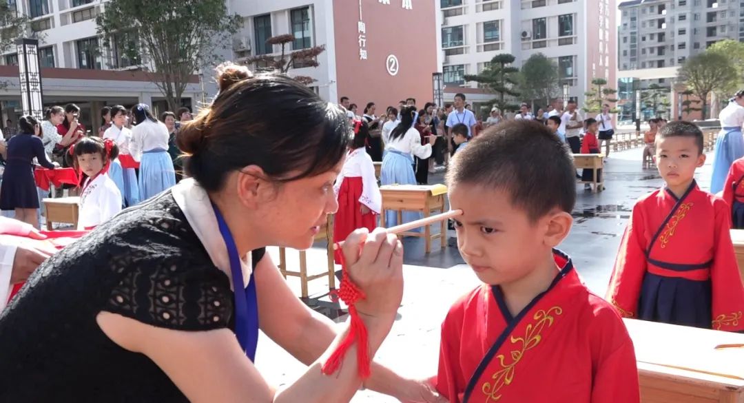 學(xué)校領(lǐng)導(dǎo)和老師們俯下身子,笑意盈盈地逐個為孩子們點(diǎn)朱砂,一張張稚氣的臉上多了一分靈氣和自信。