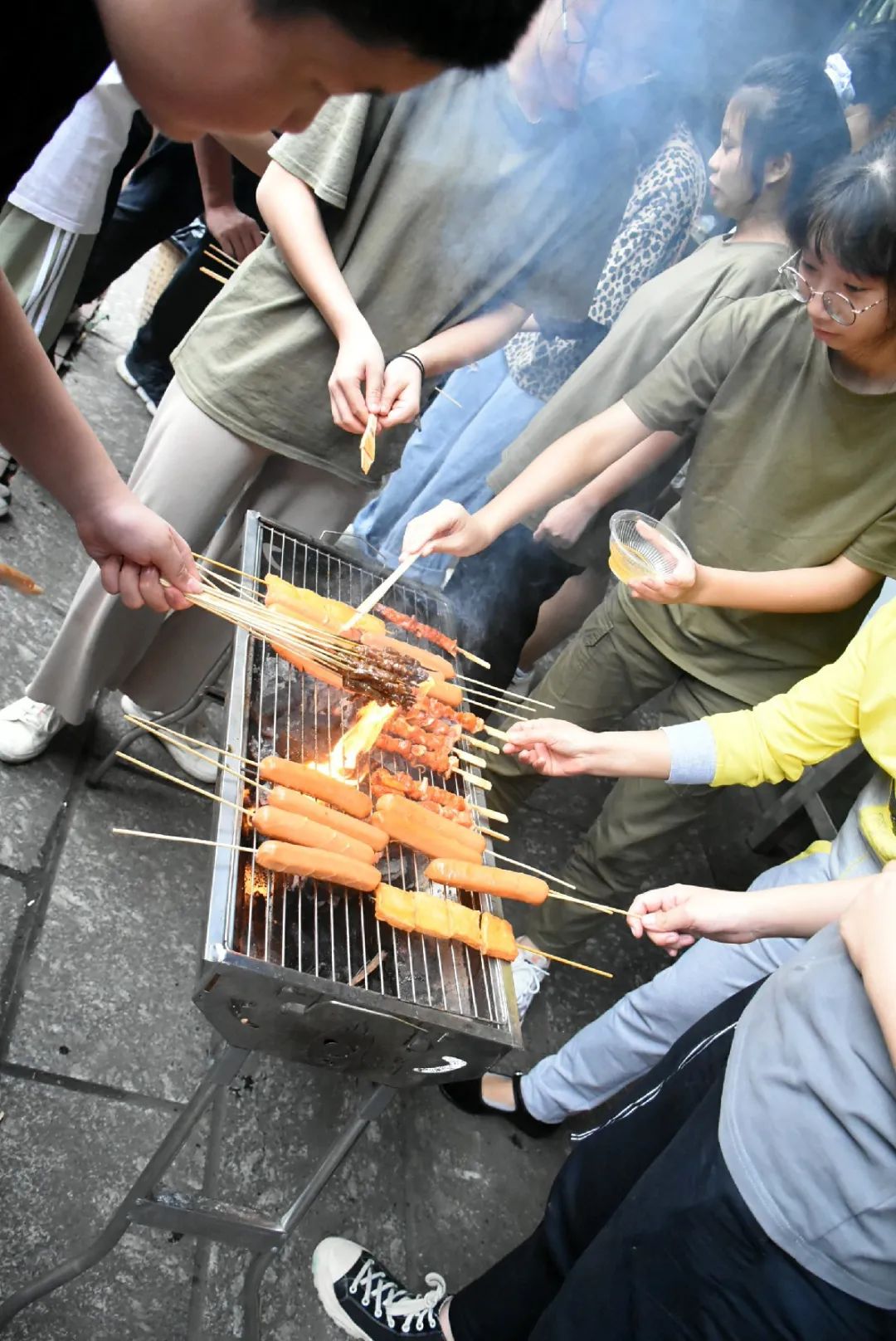 一串串肉被擺在烤架上,醬料被調(diào)配著,歡笑大鬧間,丫山下的我們是如此可愛,“大廚”翻著烤肉,平日不愛勞動的“大哥”這時也變得勤奮可靠,一直為大家烤食物,是“大廚”中的中流砥柱,老師們也檫拳磨掌,在燒烤一線奮戰(zhàn)。