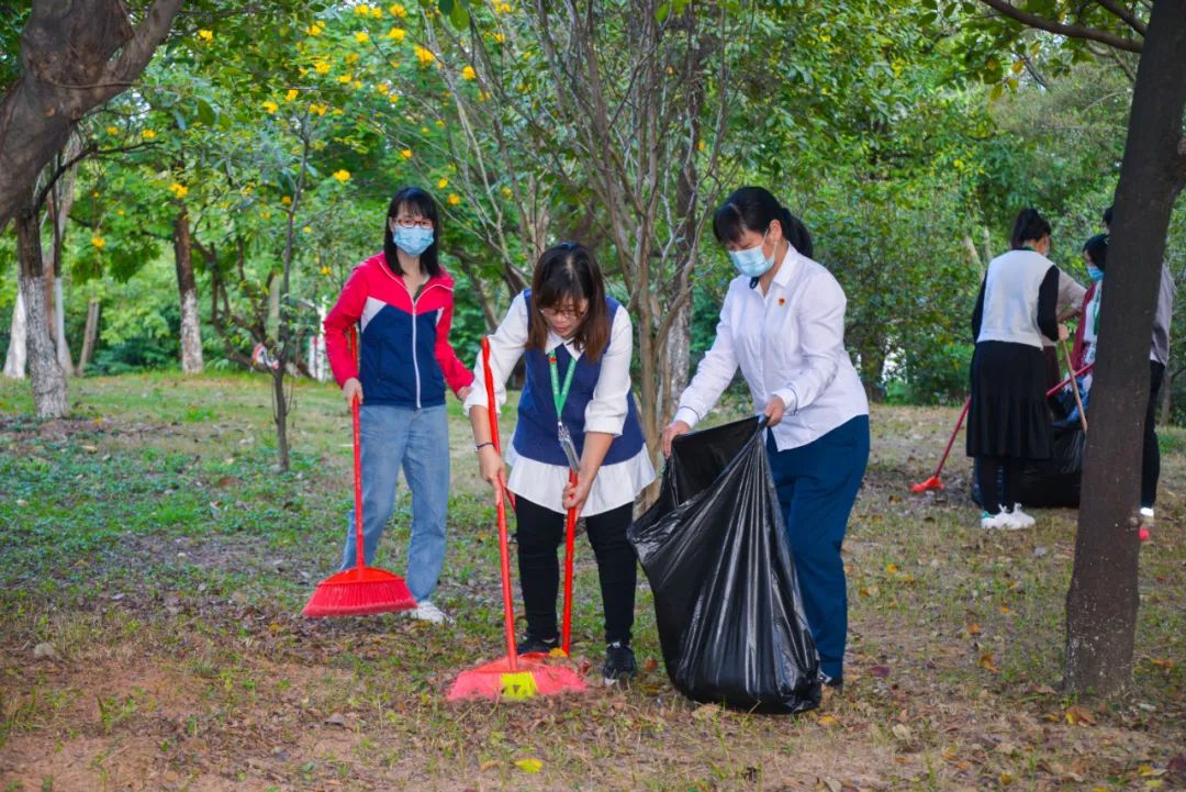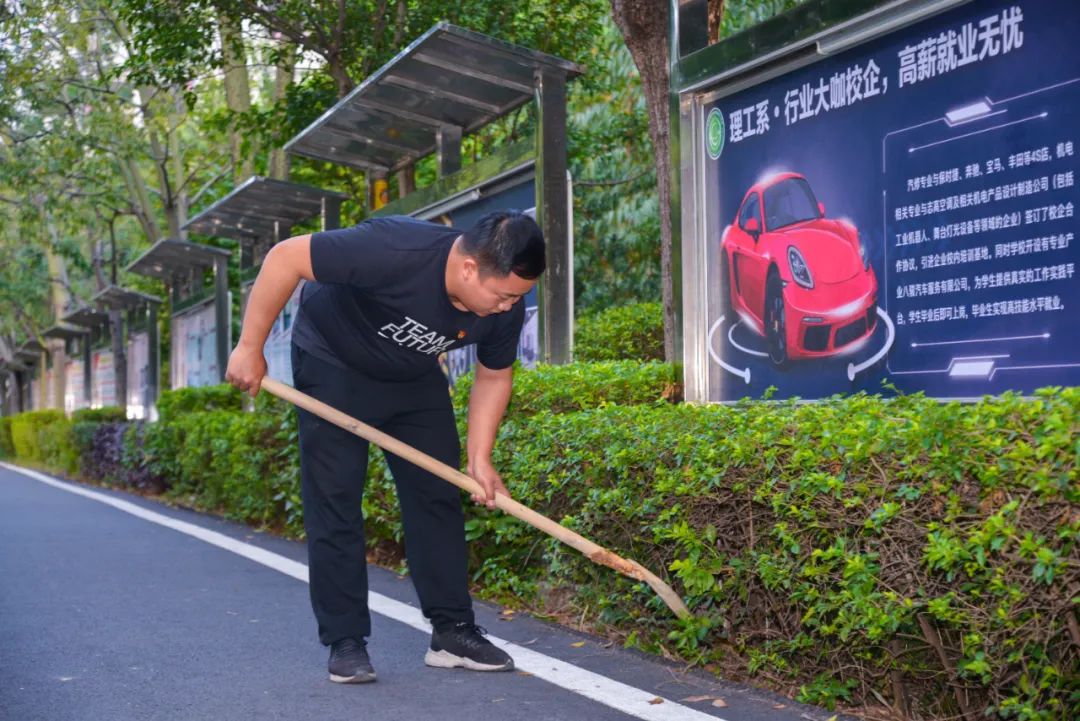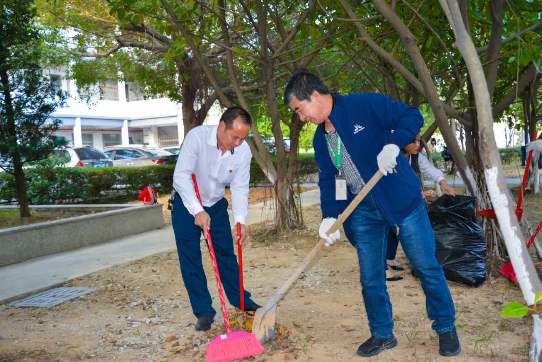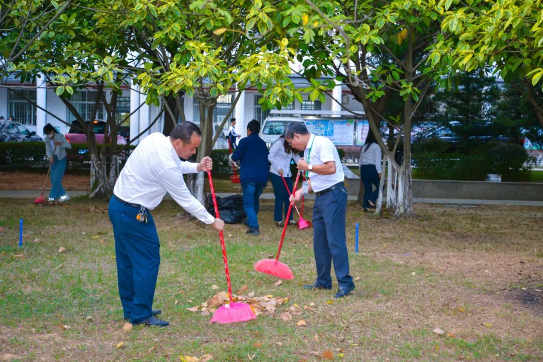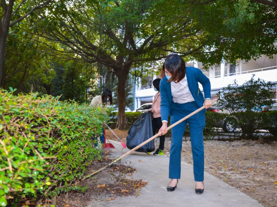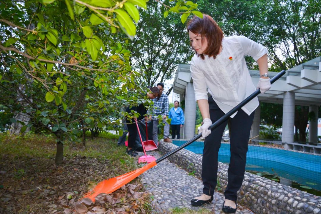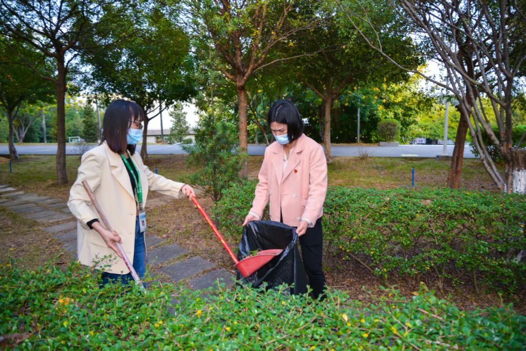 黨員們佩戴黨徽,情緒高漲,熱情飽滿,清理中堅(jiān)樓小樹林及厚德大道等區(qū)域綠化帶中的落葉,不放過任何死角,大家勞動(dòng)的身影猶如一道亮麗的風(fēng)景。